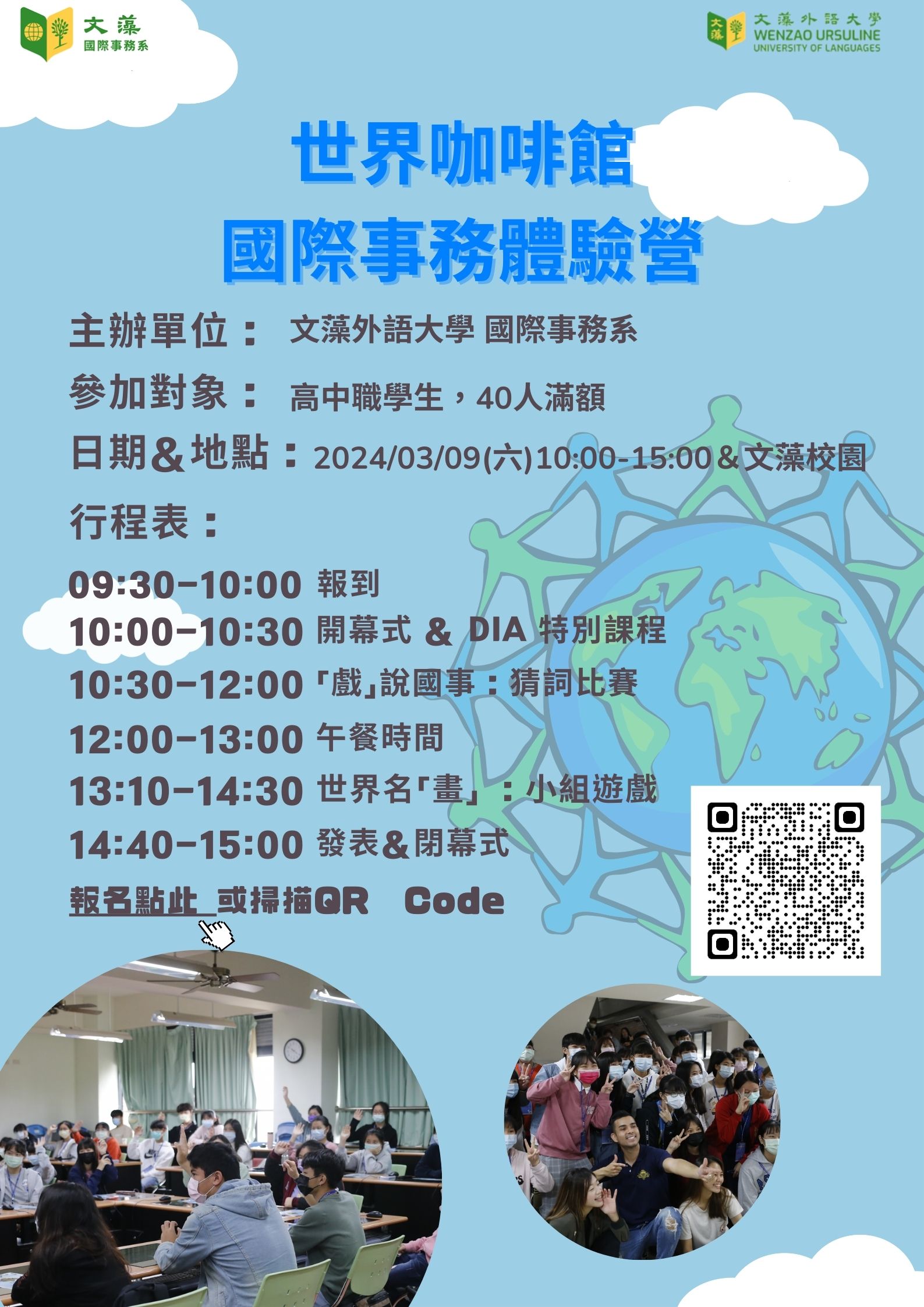 一、為提供高中職學子認識國際事務知識,增廣國際文化視野,提升英語能力之機會,藉此體驗大學多元化的學習氛圍,以協助提前規劃未來升學方向,特辦理「世界咖啡館 國際事務體驗營」活動。