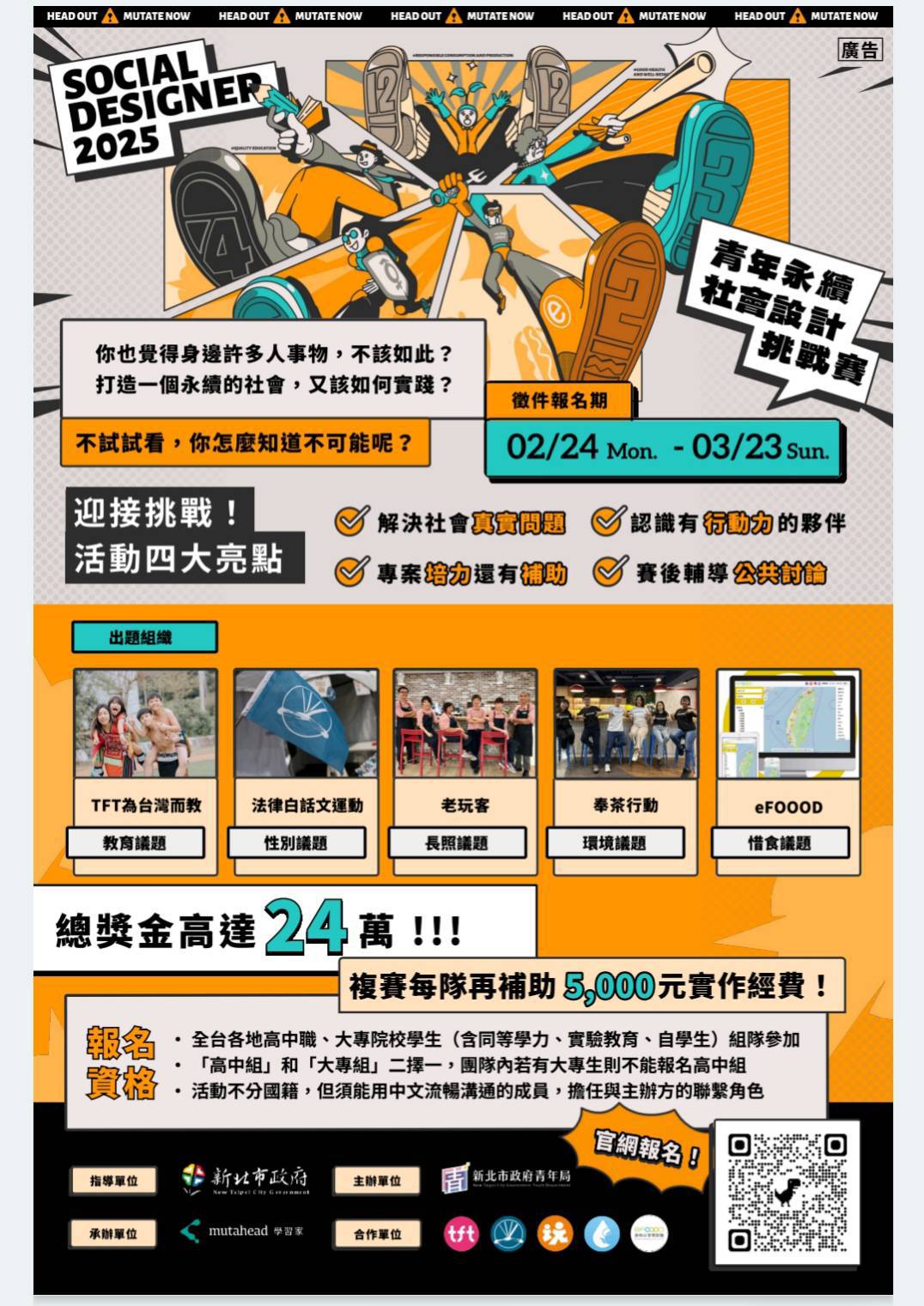 (五) 賽程及參加辦法詳見IG帳號:@social.designer.tw 及網址:https://socialdesigner.tw/socialdesigner2025/。