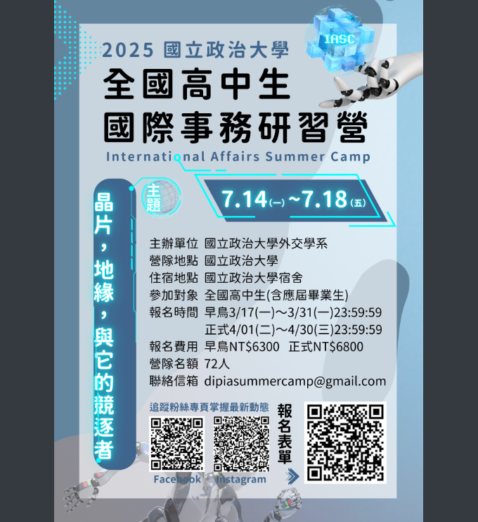 三、檢送活動海報電子檔,可自行影印使用,敬請惠予協助宣傳並鼓勵學生踴躍參加。相關活動資訊請上活動官方臉書粉絲專頁或Instagram頁面查詢:https://www.facebook.com/nccuiacamp2025,或FB搜尋「2025全國高中生國際事務研習營」;https://www.instagram.com/nccudip_iasc2025?igsh=NmhseXgxdGRjbTFo&utm_source=qr,或IG搜尋「2025政大外交國際事務研習營」。