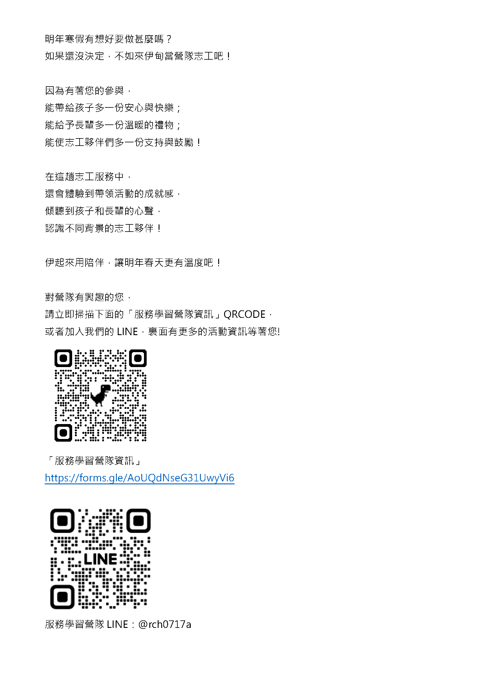 二、 分享內容:附件一為電子公告分享的內容,另外附件二和三為活動資訊,煩請貴校承辦人員協助,將活動資訊公佈於學校電子公告欄、學校或系所網站、社團粉絲專頁等線上平台,向貴校學生鼓勵推廣參與本會志工營隊。